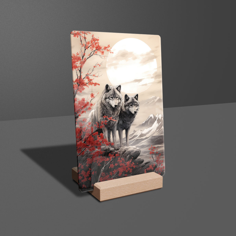 Na produktovém fotu vyobrazena nejoblíbenější varianta akrylového skla 14x21/21x14cm a dřevěný stojánek 10x10cm.