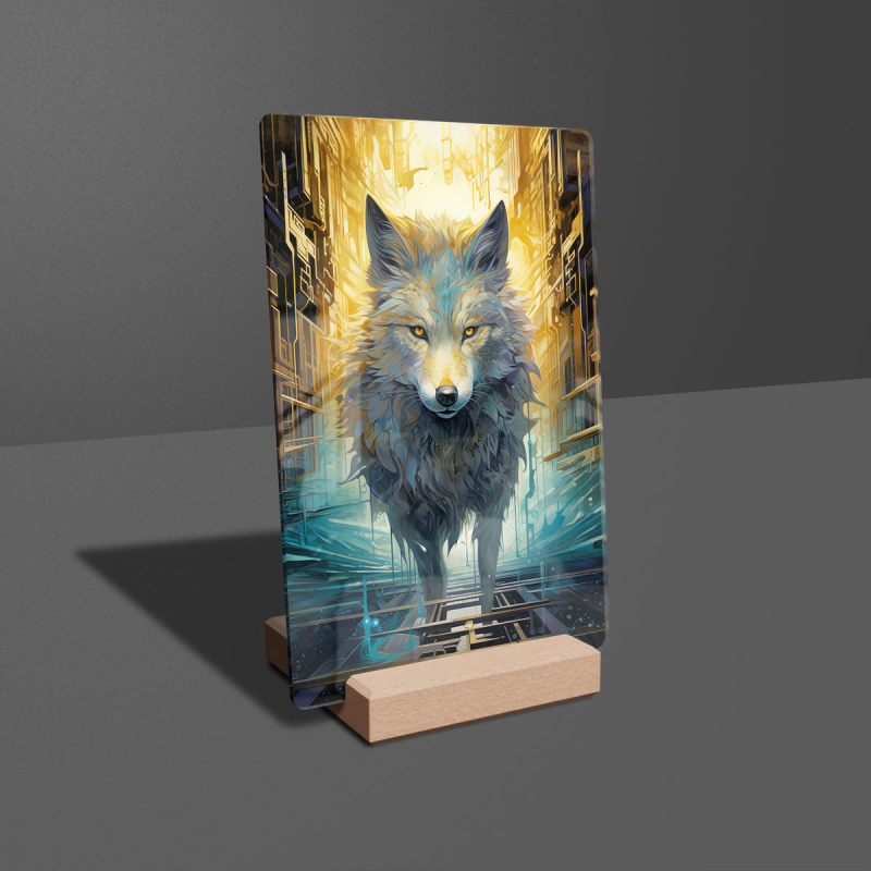 Na produktovém fotu vyobrazena nejoblíbenější varianta akrylového skla 14x21/21x14cm a dřevěný stojánek 10x10cm.