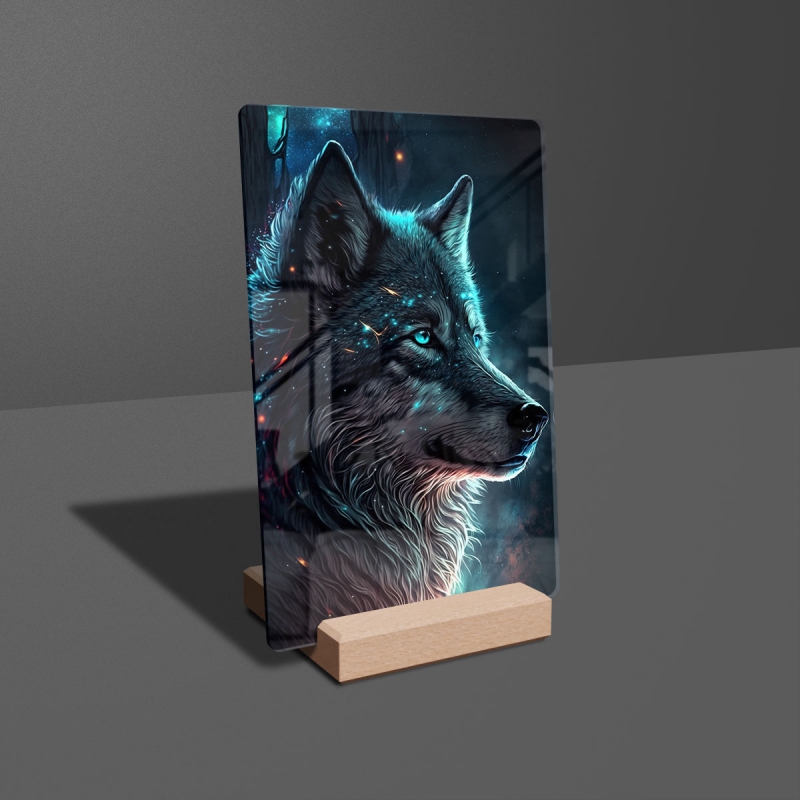 Na produktovém fotu vyobrazena nejoblíbenější varianta akrylového skla 14x21/21x14cm a dřevěný stojánek 10x10cm.