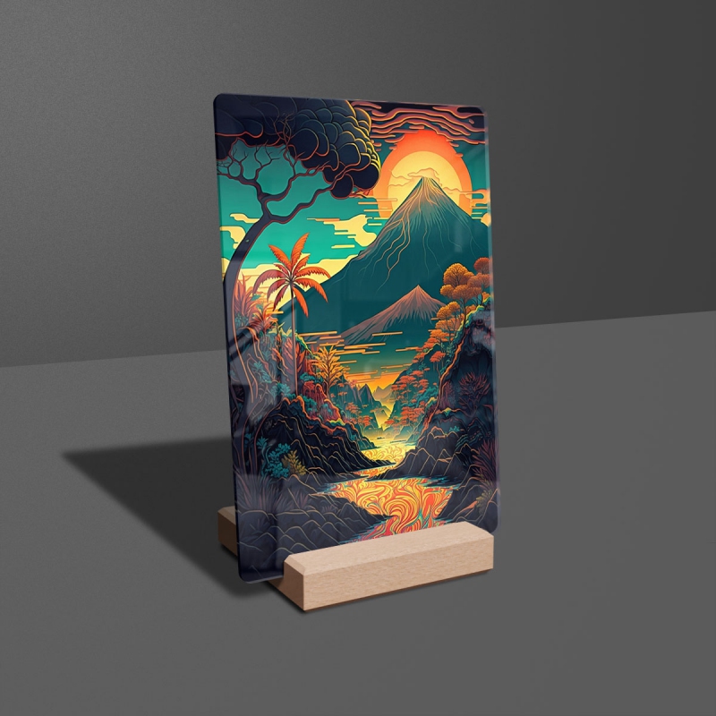 Na produktovém fotu vyobrazena nejoblíbenější varianta akrylového skla 14x21/21x14cm a dřevěný stojánek 10x10cm.
