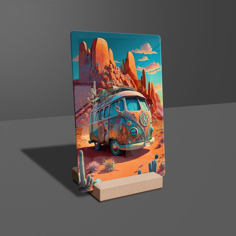 Na produktovém fotu vyobrazena nejoblíbenější varianta akrylového skla 14x21/21x14cm a dřevěný stojánek 10x10cm.