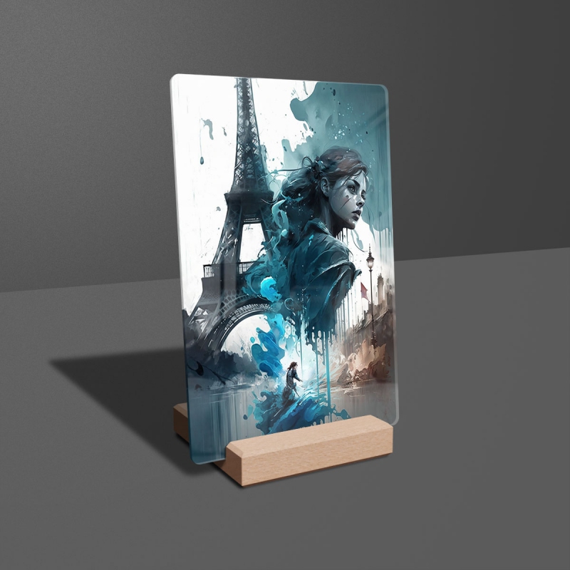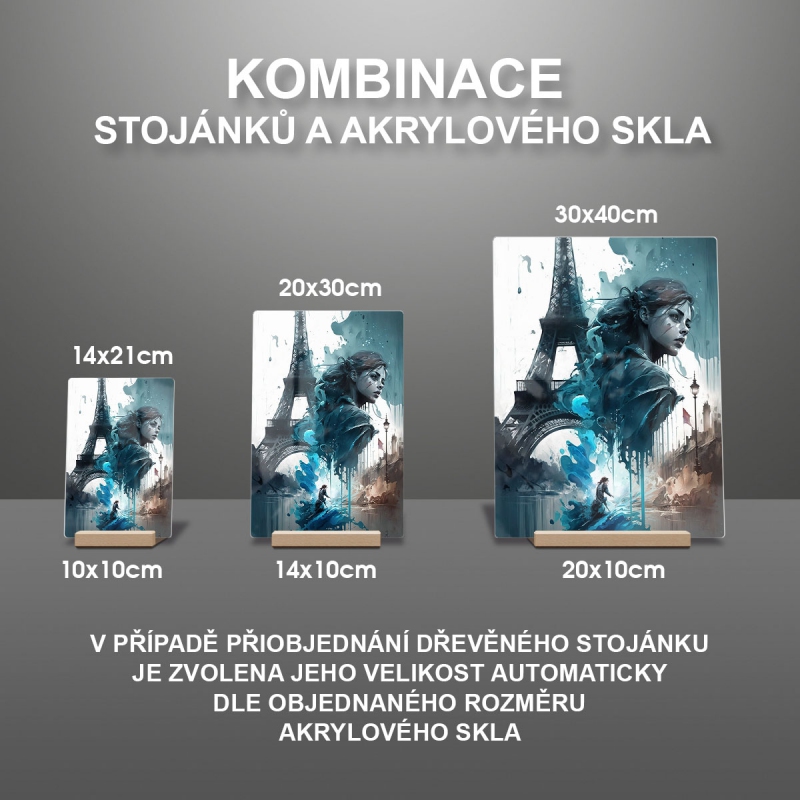 Na produktovém fotu vyobrazena nejoblíbenější varianta akrylového skla 14x21/21x14cm a dřevěný stojánek 10x10cm.