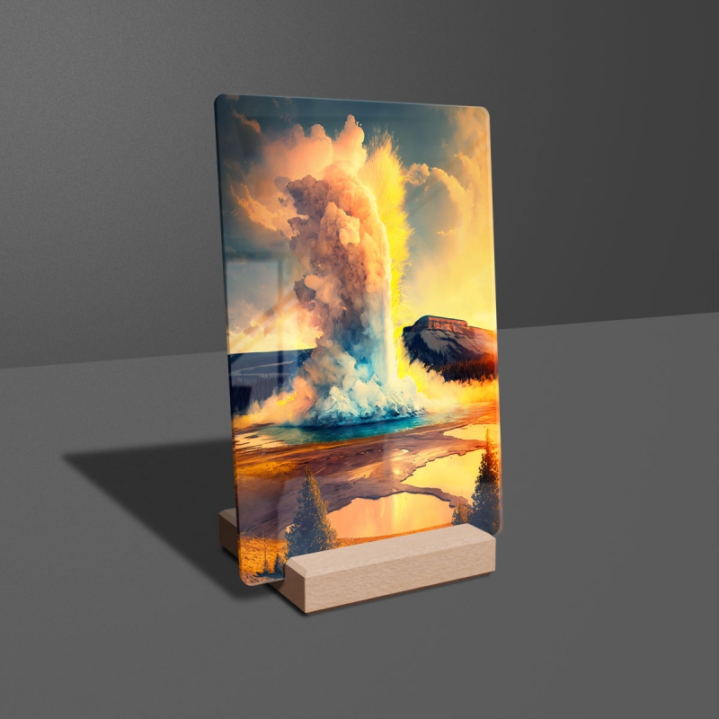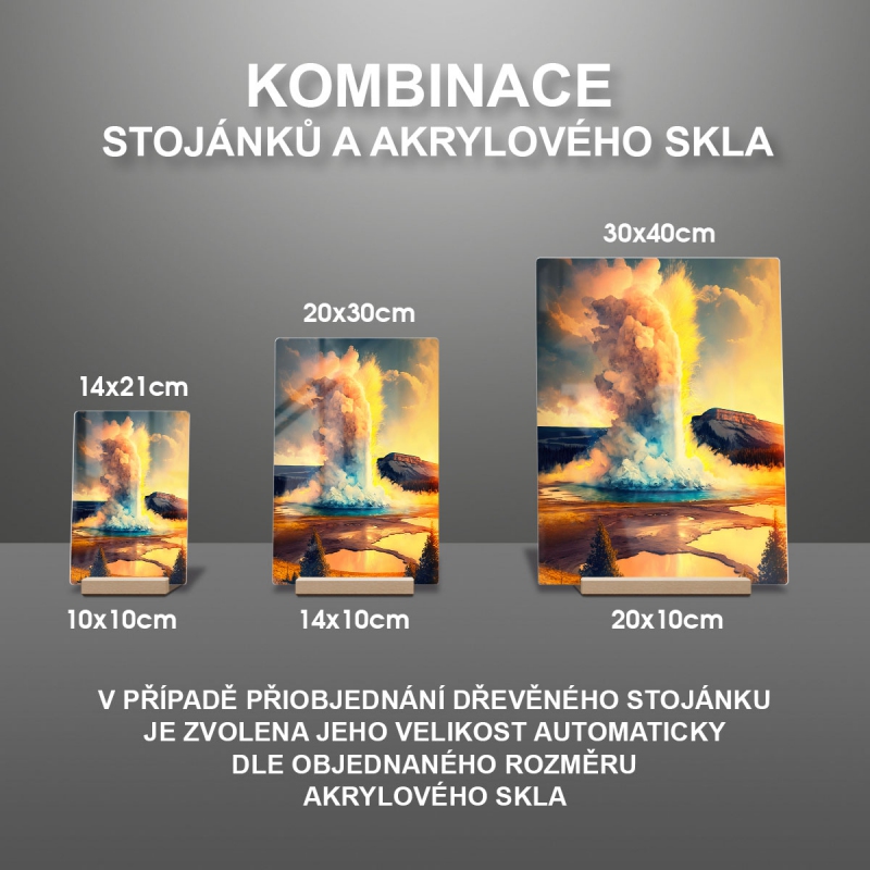 Na produktovém fotu vyobrazena nejoblíbenější varianta akrylového skla 14x21/21x14cm a dřevěný stojánek 10x10cm.