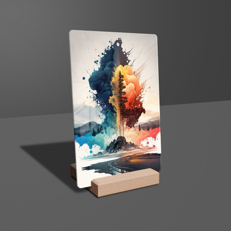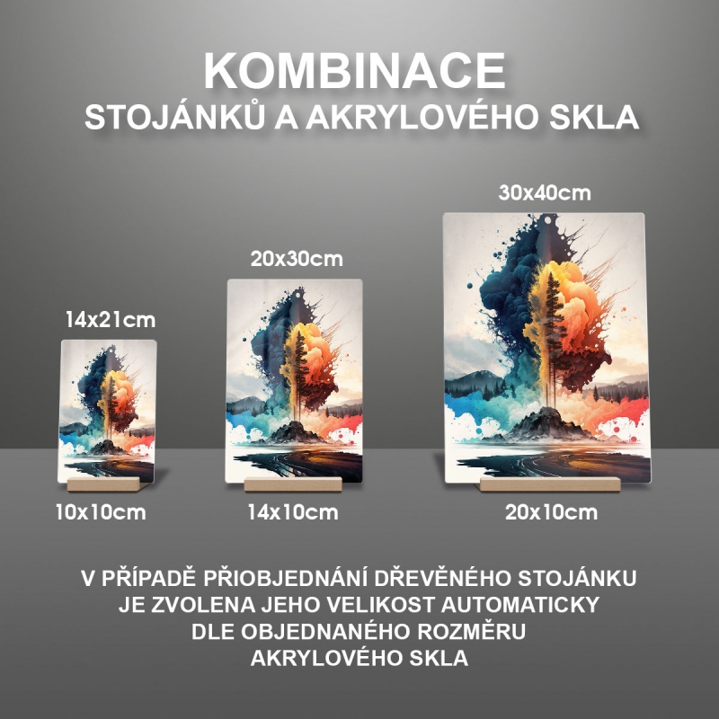 Na produktovém fotu vyobrazena nejoblíbenější varianta akrylového skla 14x21/21x14cm a dřevěný stojánek 10x10cm.
