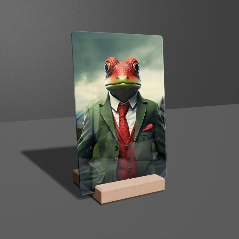 Na produktovém fotu vyobrazena nejoblíbenější varianta akrylového skla 14x21/21x14cm a dřevěný stojánek 10x10cm.