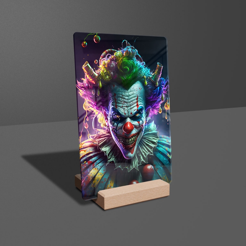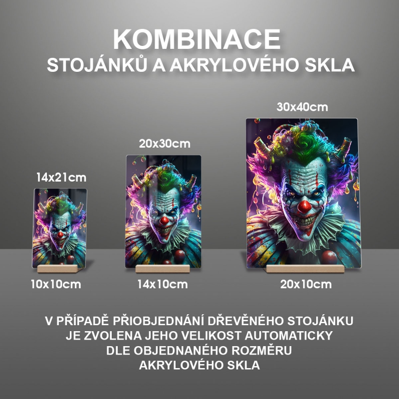 Na produktovém fotu vyobrazena nejoblíbenější varianta akrylového skla 14x21/21x14cm a dřevěný stojánek 10x10cm.