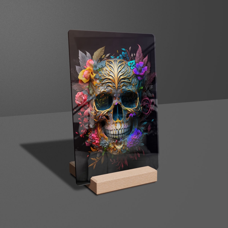 Na produktovém fotu vyobrazena nejoblíbenější varianta akrylového skla 14x21/21x14cm a dřevěný stojánek 10x10cm.
