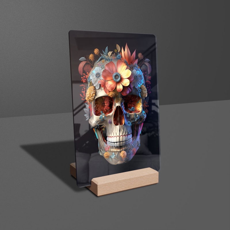Na produktovém fotu vyobrazena nejoblíbenější varianta akrylového skla 14x21/21x14cm a dřevěný stojánek 10x10cm.