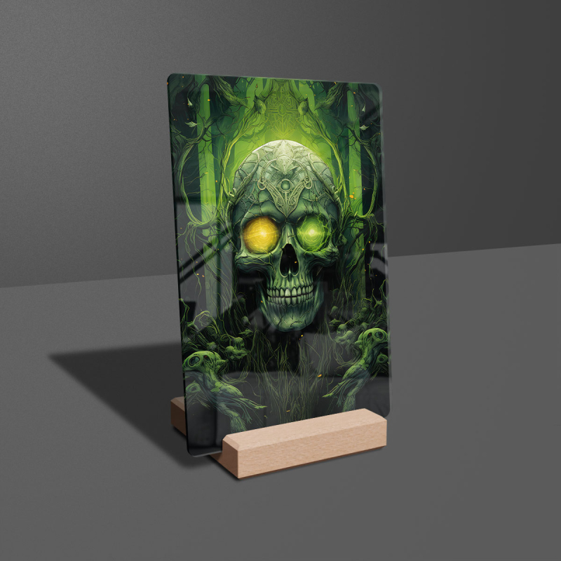 Na produktovém fotu vyobrazena nejoblíbenější varianta akrylového skla 14x21/21x14cm a dřevěný stojánek 10x10cm.
