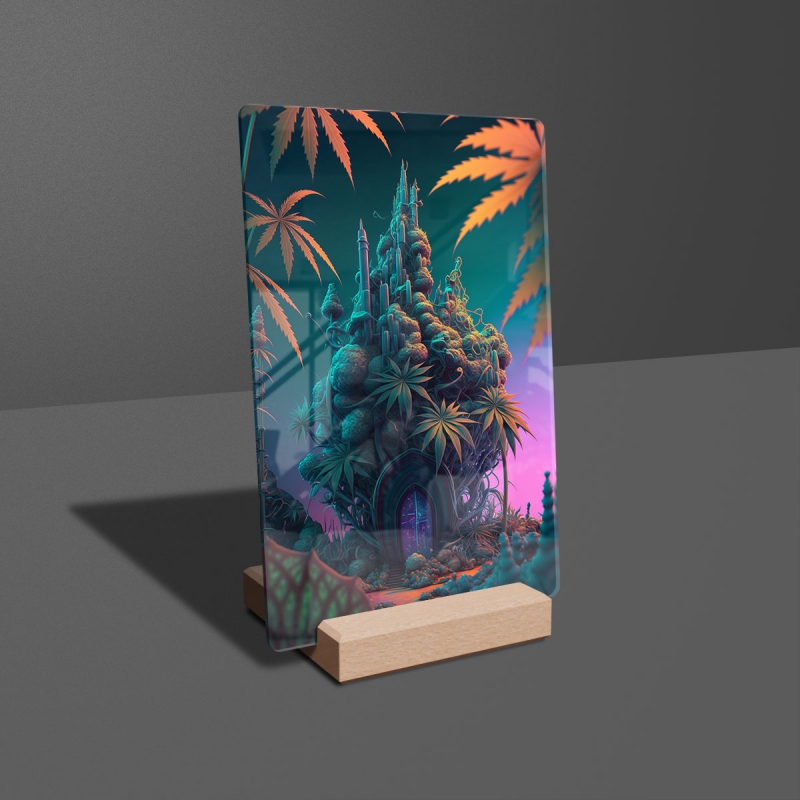 Na produktovém fotu vyobrazena nejoblíbenější varianta akrylového skla 14x21/21x14cm a dřevěný stojánek 10x10cm.