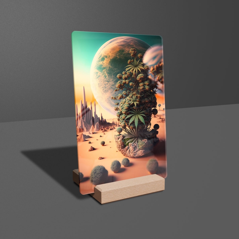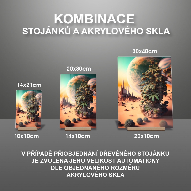 Na produktovém fotu vyobrazena nejoblíbenější varianta akrylového skla 14x21/21x14cm a dřevěný stojánek 10x10cm.