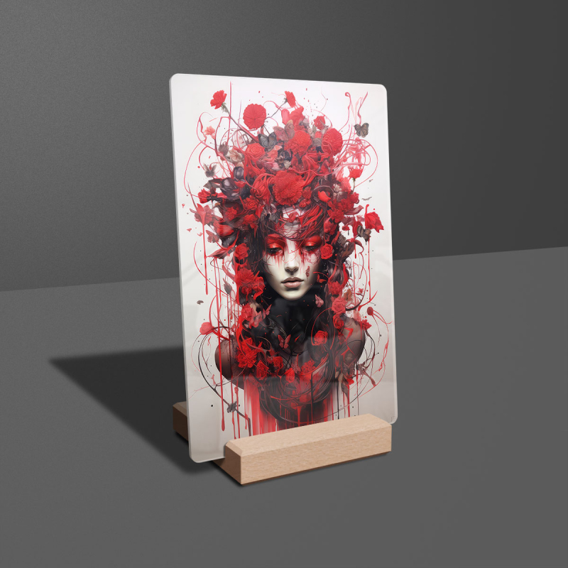 Na produktovém fotu vyobrazena nejoblíbenější varianta akrylového skla 14x21/21x14cm a dřevěný stojánek 10x10cm.
