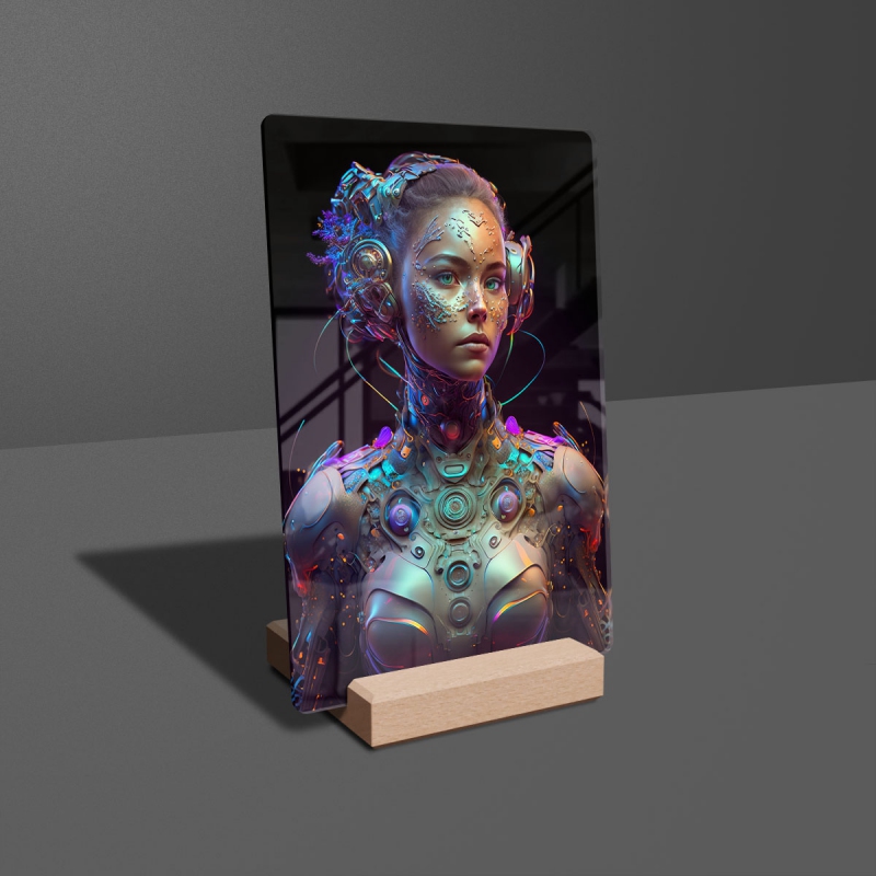 Na produktovém fotu vyobrazena nejoblíbenější varianta akrylového skla 14x21/21x14cm a dřevěný stojánek 10x10cm.