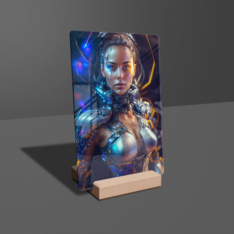 Na produktovém fotu vyobrazena nejoblíbenější varianta akrylového skla 14x21/21x14cm a dřevěný stojánek 10x10cm.