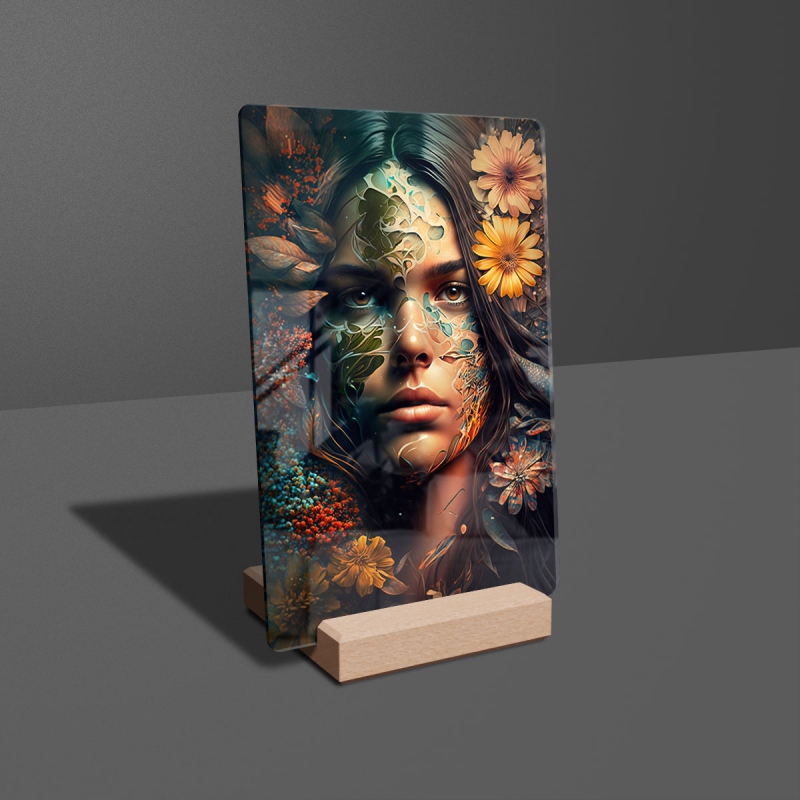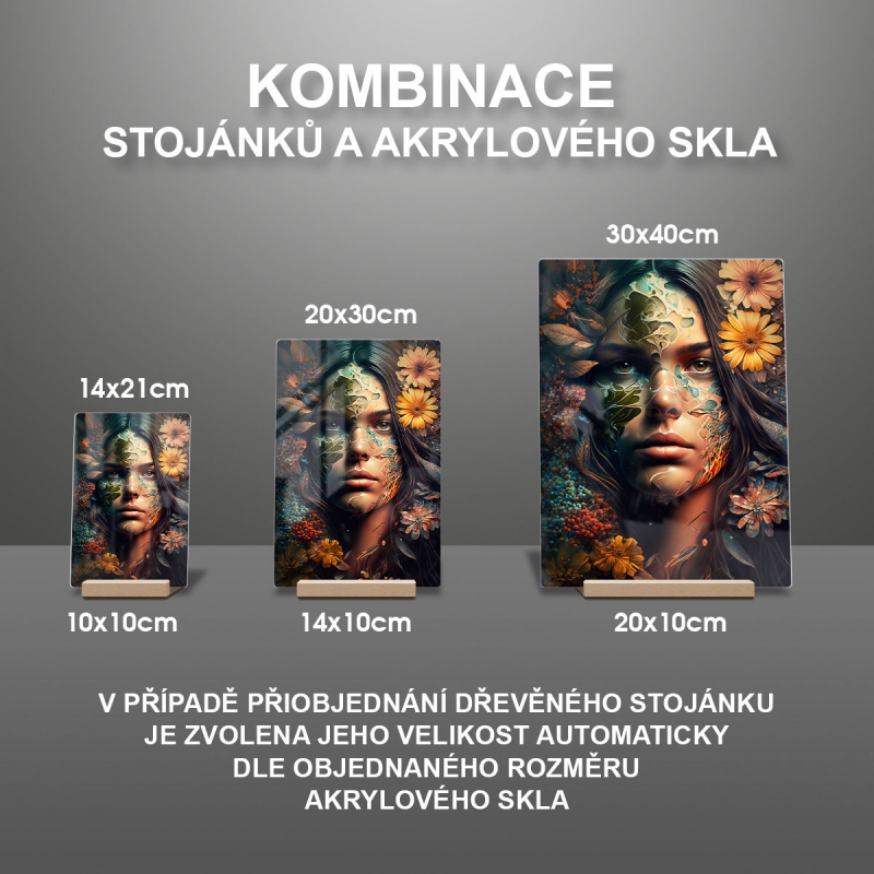 Na produktovém fotu vyobrazena nejoblíbenější varianta akrylového skla 14x21/21x14cm a dřevěný stojánek 10x10cm.