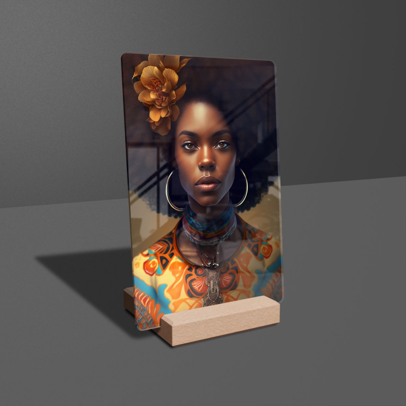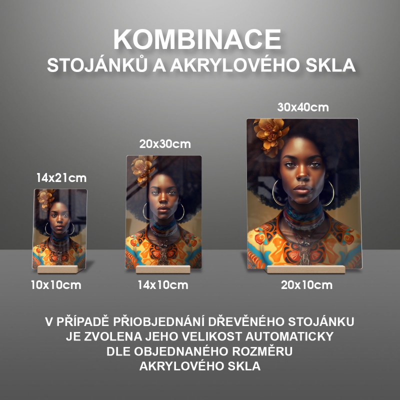 Na produktovém fotu vyobrazena nejoblíbenější varianta akrylového skla 14x21/21x14cm a dřevěný stojánek 10x10cm.