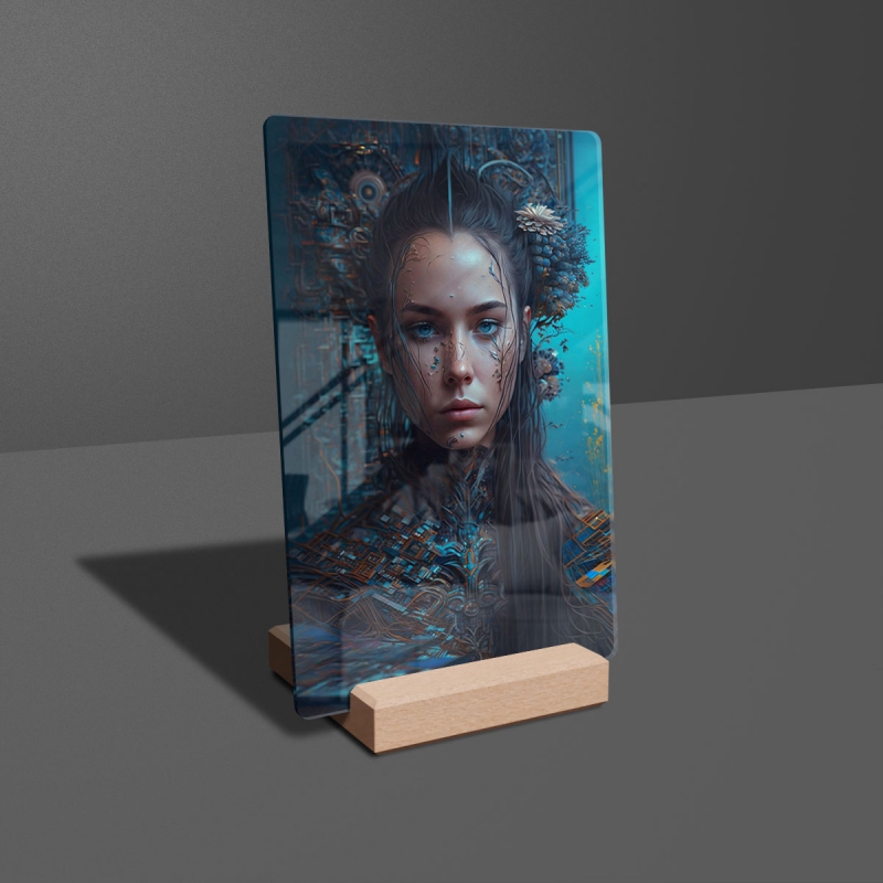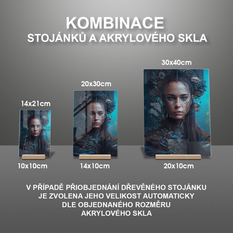 Na produktovém fotu vyobrazena nejoblíbenější varianta akrylového skla 14x21/21x14cm a dřevěný stojánek 10x10cm.
