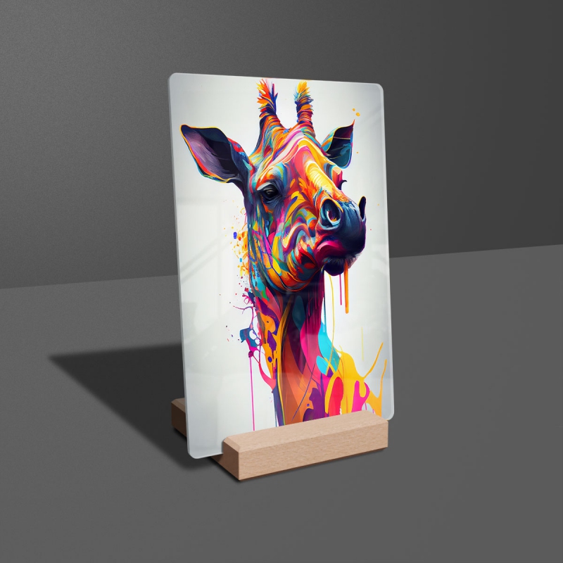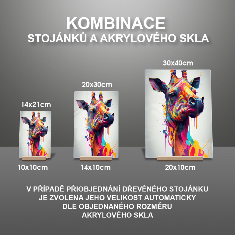 Na produktovém fotu vyobrazena nejoblíbenější varianta akrylového skla 14x21/21x14cm a dřevěný stojánek 10x10cm.