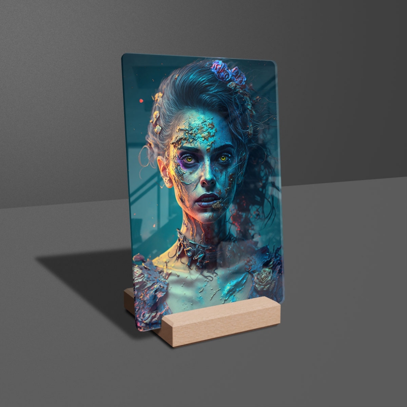 Na produktovém fotu vyobrazena nejoblíbenější varianta akrylového skla 14x21/21x14cm a dřevěný stojánek 10x10cm.