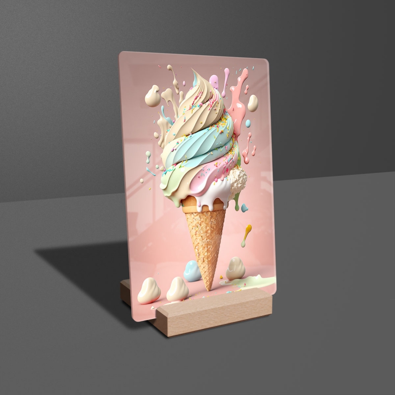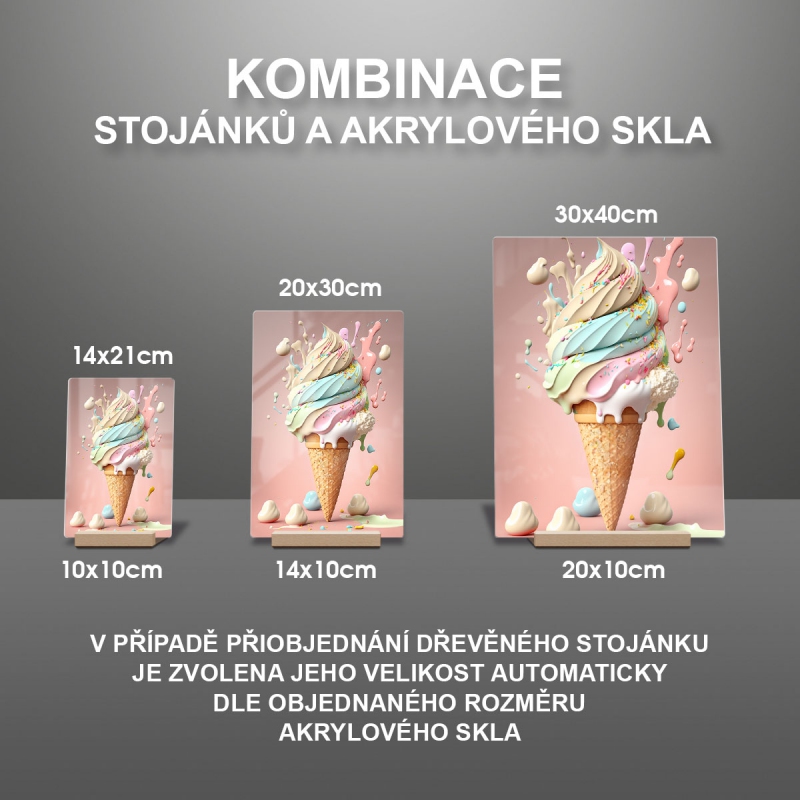 Na produktovém fotu vyobrazena nejoblíbenější varianta akrylového skla 14x21/21x14cm a dřevěný stojánek 10x10cm.