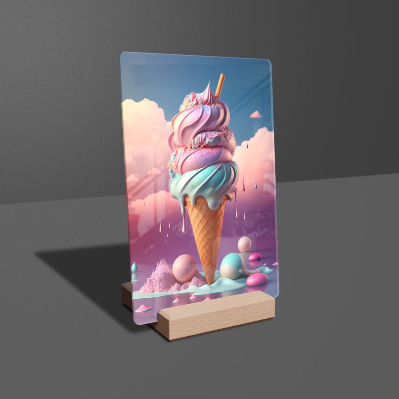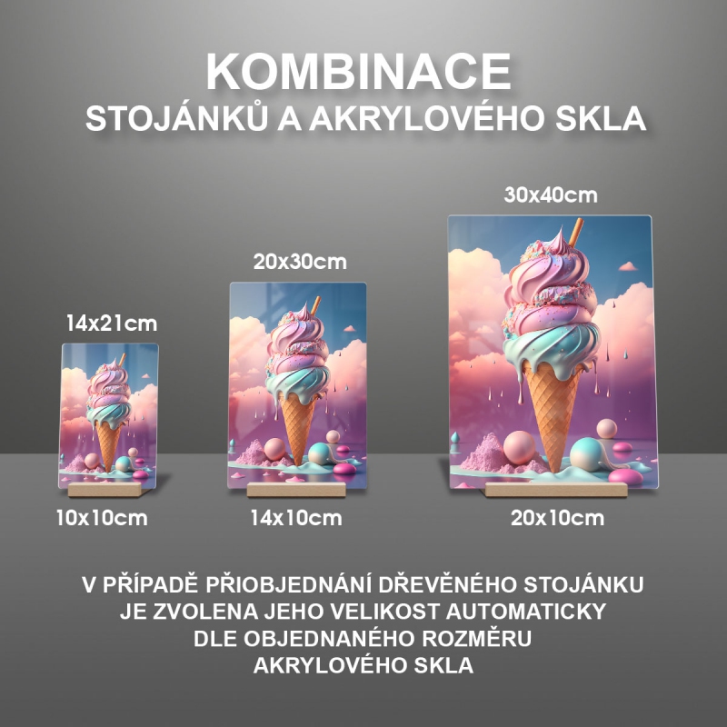 Na produktovém fotu vyobrazena nejoblíbenější varianta akrylového skla 14x21/21x14cm a dřevěný stojánek 10x10cm.