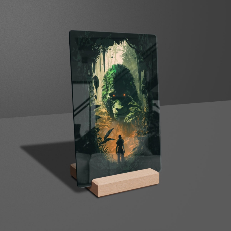 Na produktovém fotu vyobrazena nejoblíbenější varianta akrylového skla 14x21/21x14cm a dřevěný stojánek 10x10cm.