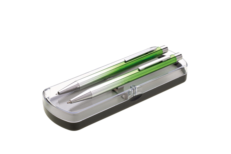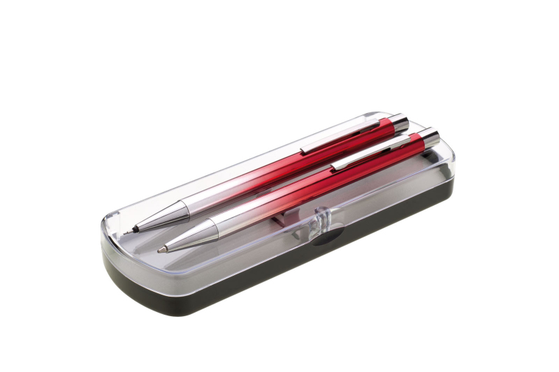 Kovová propiska a mikrotužka mají přechodový efekt barvy od stříbné do červené. Pouzdro je plastové s šedým podkladem.