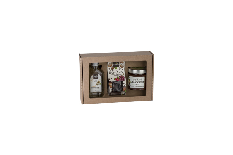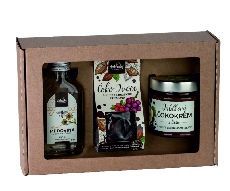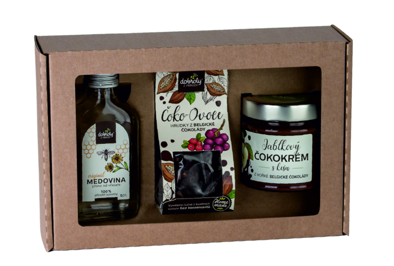 Obsahuje: Medovina Originál placatka 100 ml, Čokohrudky - hořká belgická čokoláda s ovocem a semínky 100 g, Čokokrém jablkový s kešu 200 g. Trvanlivost: 12 měsíců.