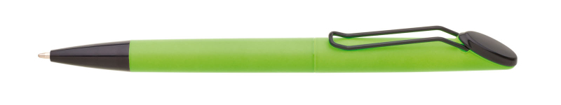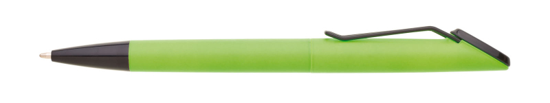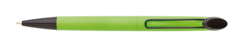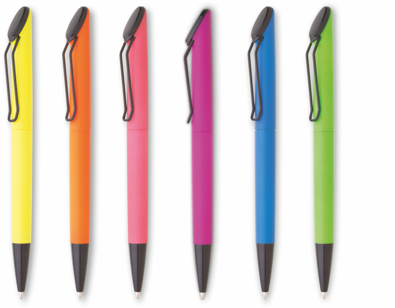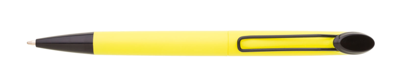 Plastová otočná propiska ARESTA v neonově žluté barvě s černou špičkou a černým kovovým klipem. Na držák klipu je možné umístit epoxy samolepku. Náplň velkoobsahová, modře píšící.