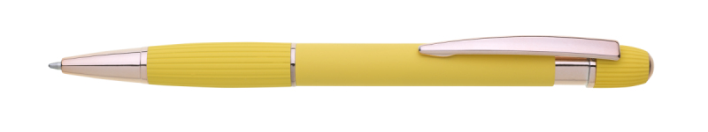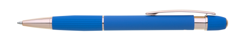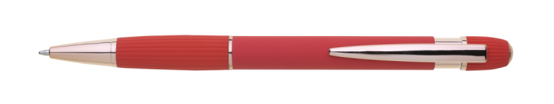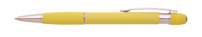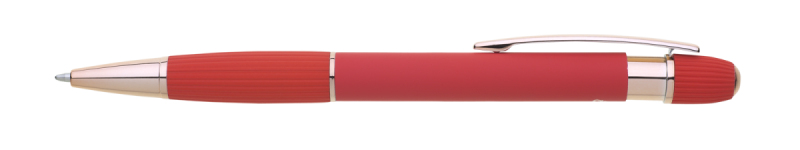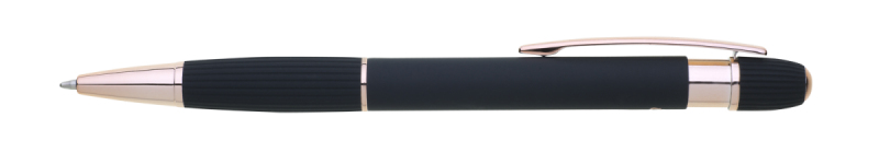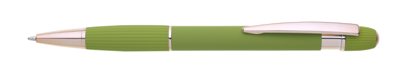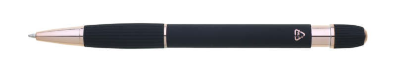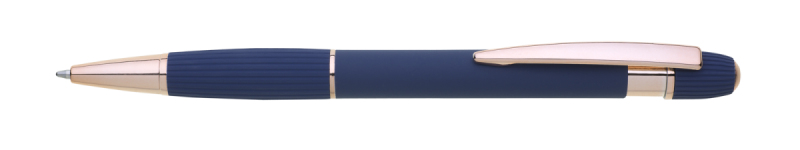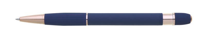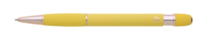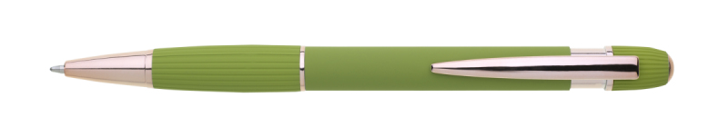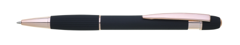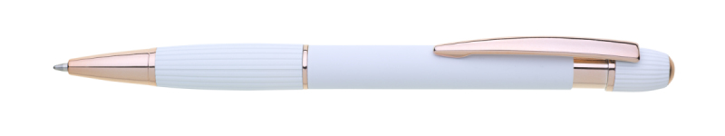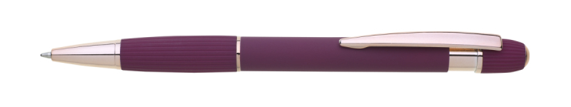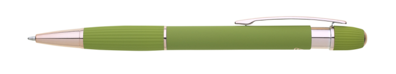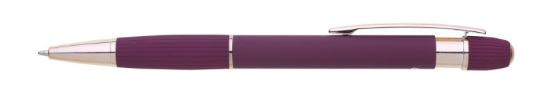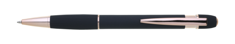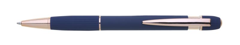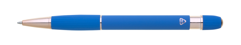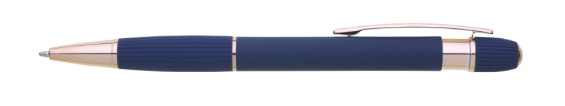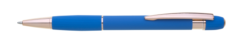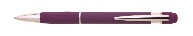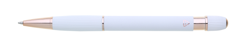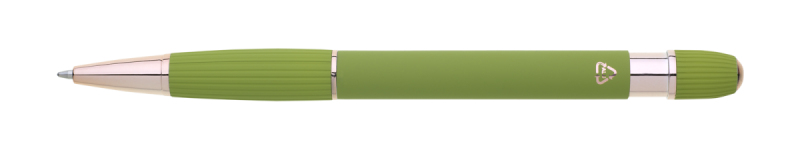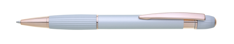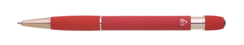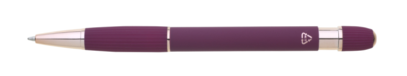 propiska z recyklovaného hliníku se soft povrchem a doplňky v růžovo-zlaté barvě. Laserované logo je lesklé, růžovo-zlaté. Náplň modře píšící. Výsledný efekt laserového značení je lesklý, v barvě doplňků.