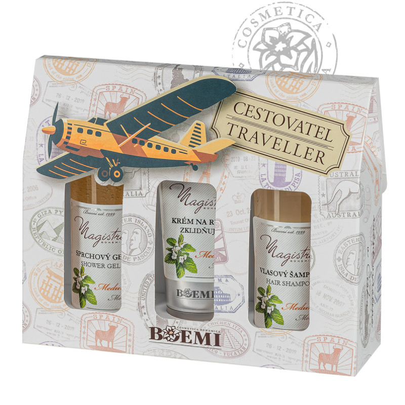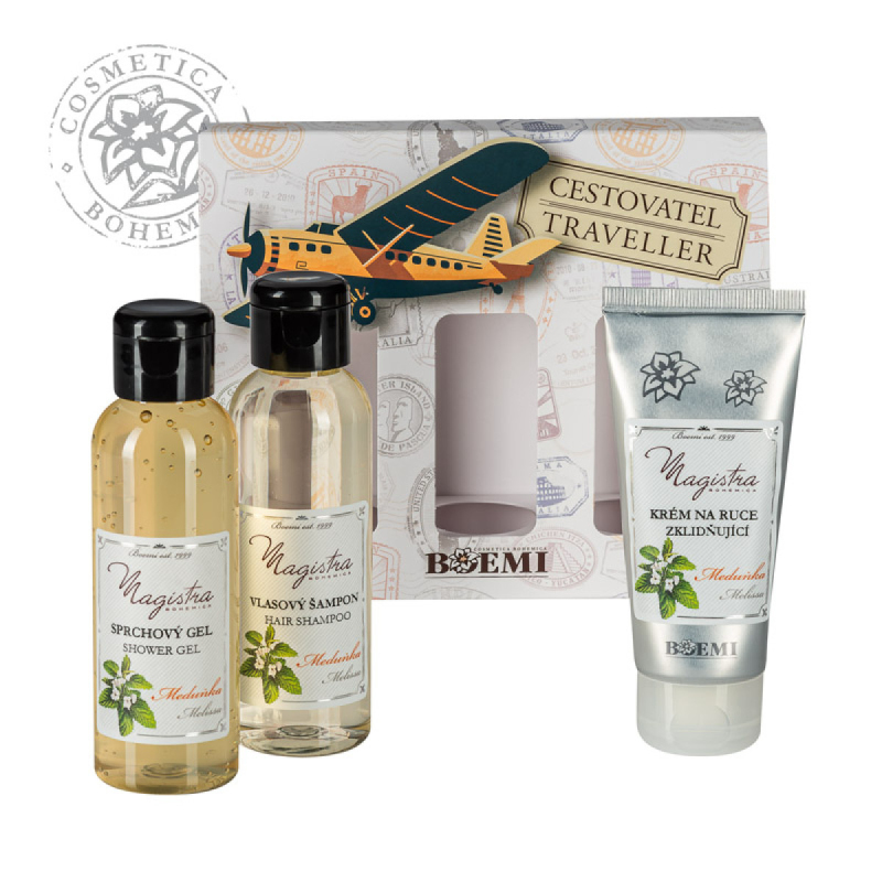Kazeta obsahuje: meduňkový sprchový gel 100 ml, vlasový šampon s jemnou lehce citrusovou vůní meduňky 100 ml, Zklidňující výživný krém na ruce 150 ml