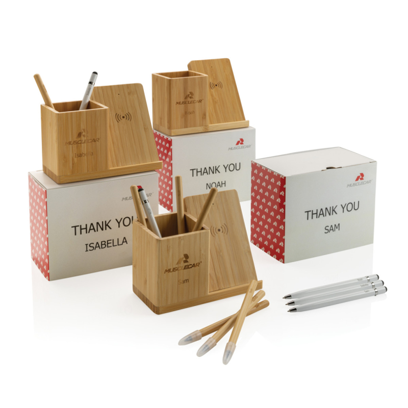 Rychlá bezdrátová nabíječka s výkonem 10 W se stojánekm na pera. Plastové části vyrobené z RCS recyklovaného ABS. RCS (Recycled Claim Standard) je globální standard, který umožňuje ověřit použití recyklovaného materiálu v produktu napříč celým dodavatelským řetězcem. Celkový podíl recyklátu dle váhy produktu: 6 % (vč. váhy bambusu). Vnější části vyrobené ze 100 % FSC® bambusu. Včetně 120 cm USB C nabíjecího kabelu z RCS recyklovaného TPE. Kompatibilní se všemi zařízeními podporujícími Qi jako jsou nejnovější generace Android a iPhone 8 a výše. Vstup USB C: 5V/2A, 9V/1,67A. Bezdrátový výstup: 5V/1A, 9V/1,1A 10 W. Baleno v FSC® dárkové krabičce. Ochranný vzor®.