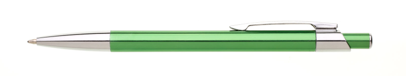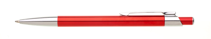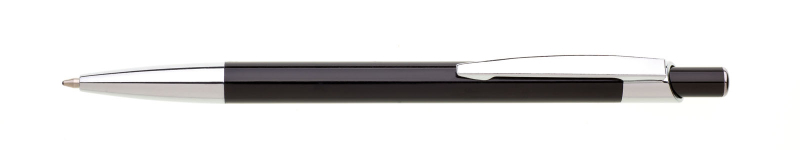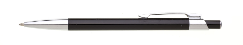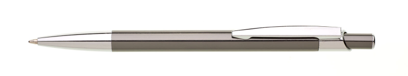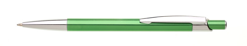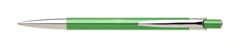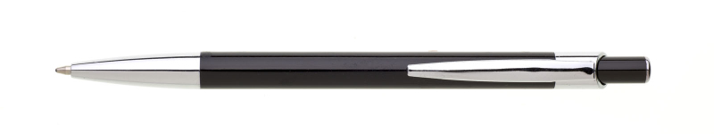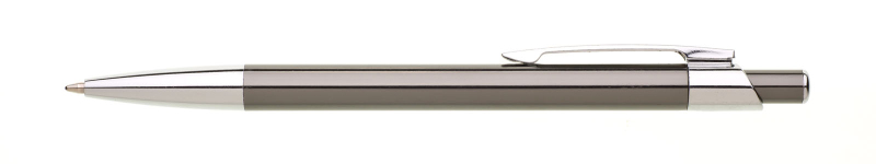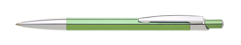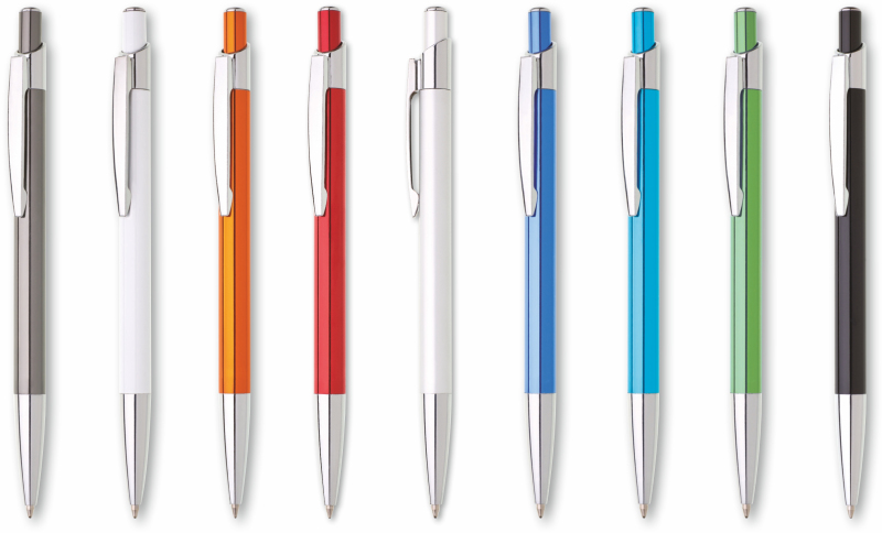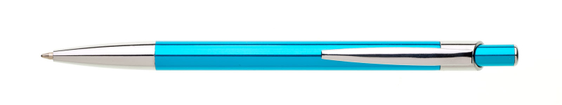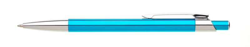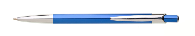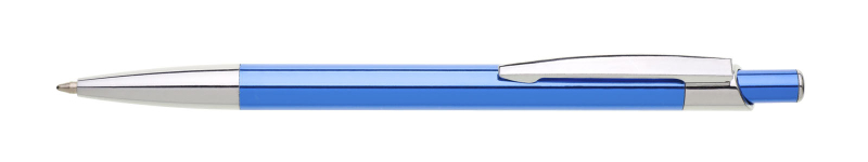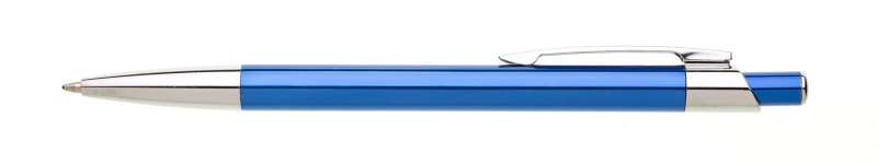 Kovová oranžová propiska s lesklým povrchem a charakteristickou protáhlou špičkou. Špička i klip jsou pochromované. Náplň velkoobsahová, modře píšící.
