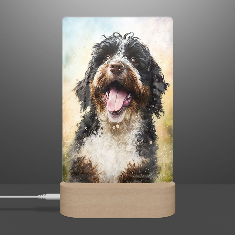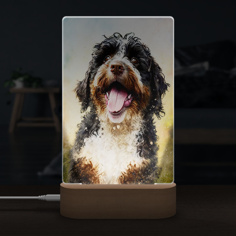 Součástí balení je akrylové sklo dle výběru, dřevěný RGB LED stojánek a napájecí USB kabel.