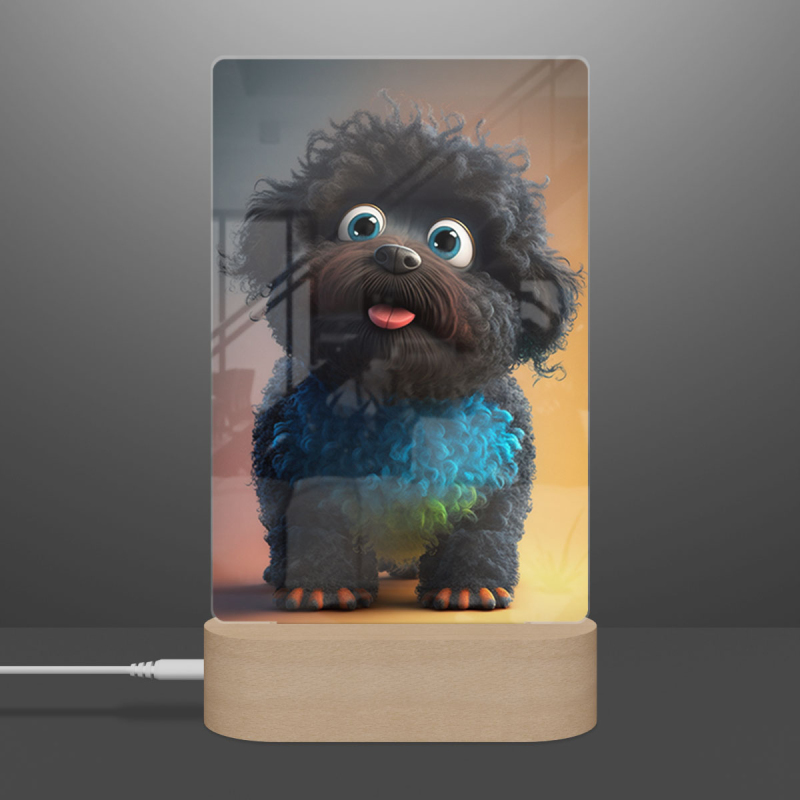Součástí balení je akrylové sklo dle výběru, dřevěný RGB LED stojánek a napájecí USB kabel.