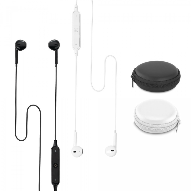 Sluchátka. ABS a PVC. S přenosem bluetooth. Autonomie až 2 hodiny. Funkce zahrnují zvedání hovorů, ovládání hlasitosti a připojení k seznamu skladeb na mobilním zařízení. Zahrnuje nabíječku s USB/mikro USB kabelem. Dodáváno v obalu z EVA. Obal: ø85 x 35 mm