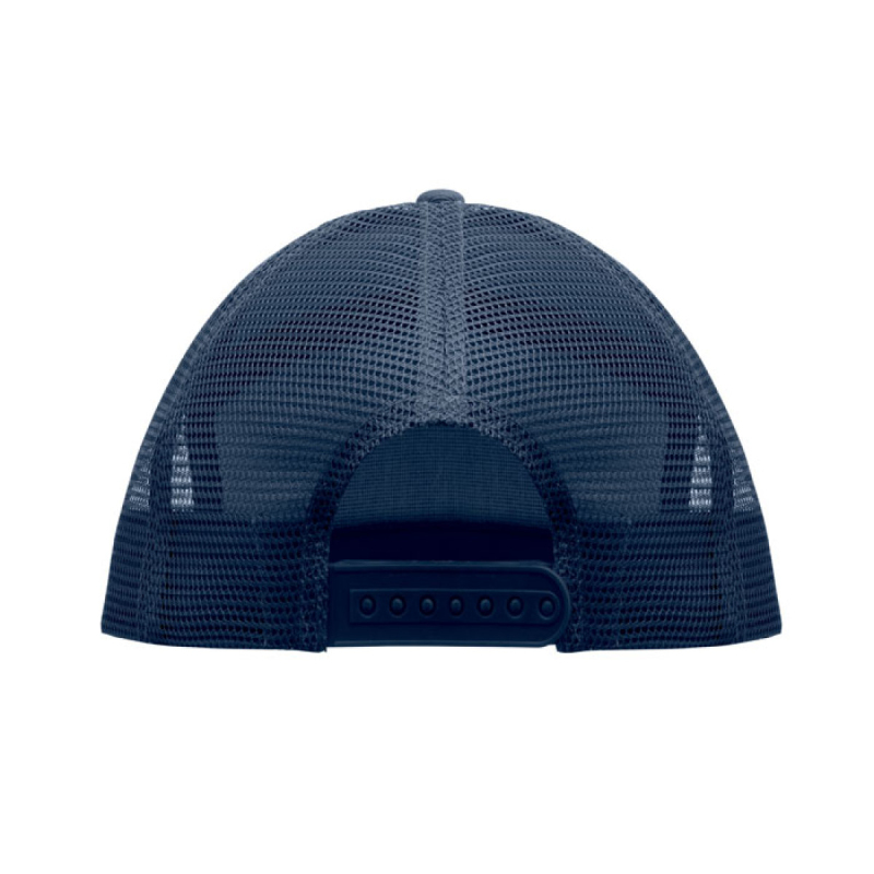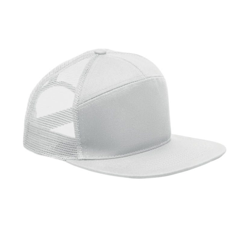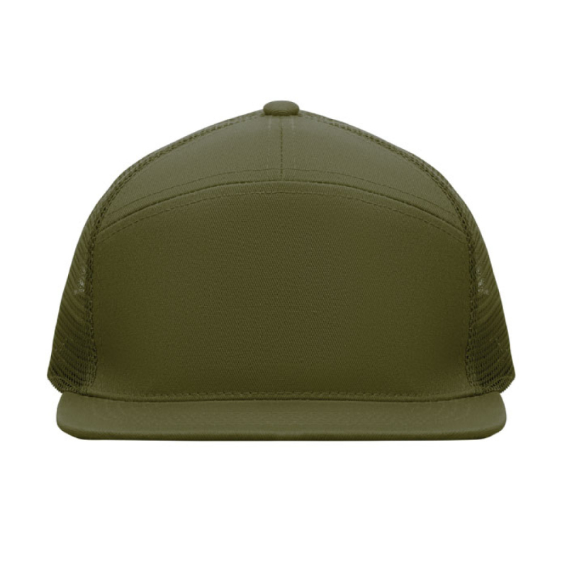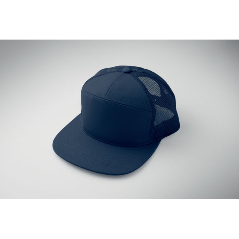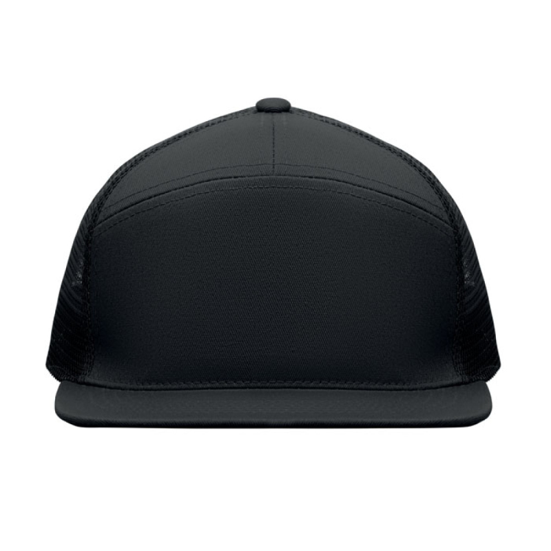 Sedmipanelová kšiltovka s plochým kšiltem z bavlněného 235g kepru s polyesterovou síťovinou na zadní straně a plastovým zapínáním.