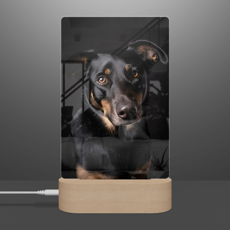 Součástí balení je akrylové sklo dle výběru, dřevěný RGB LED stojánek a napájecí USB kabel.