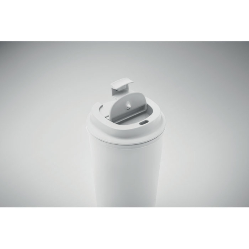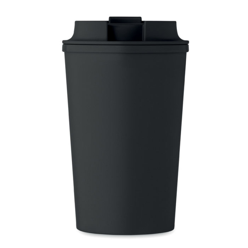 Dvoustěnný kelímek ze 100% PLA kukuřice s víčkem z recyklovaného PP. Vnitřek z TPR. Objem: 350 ml.