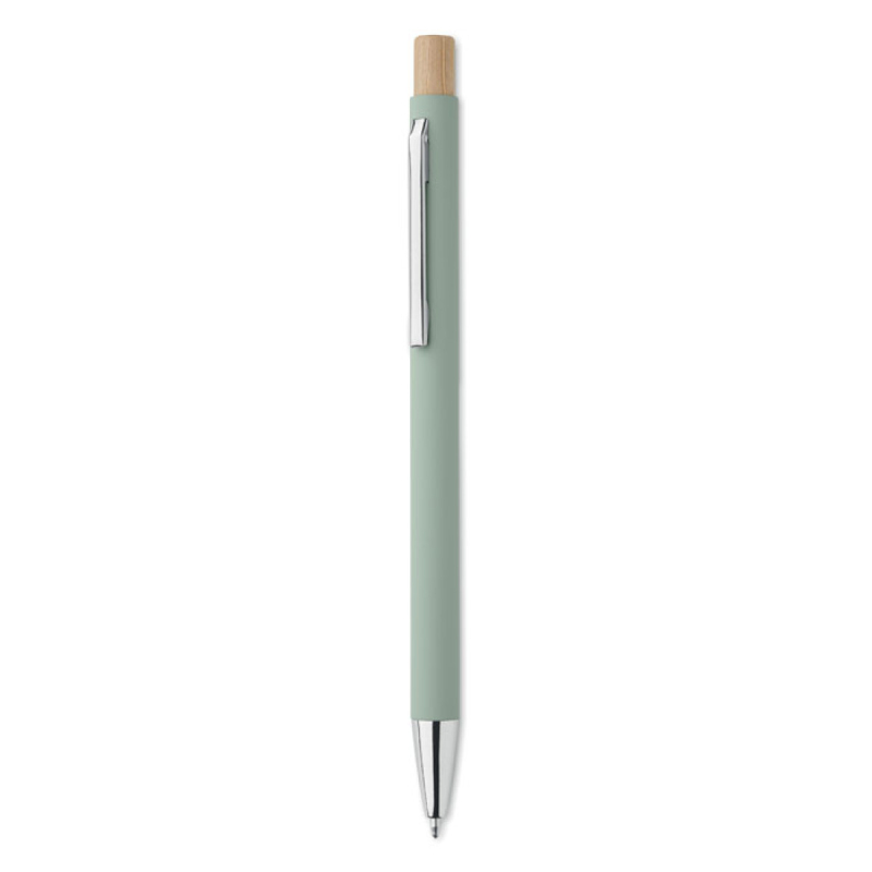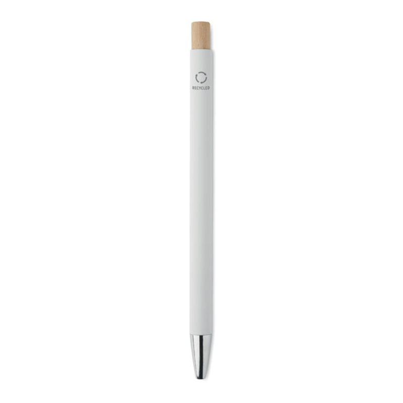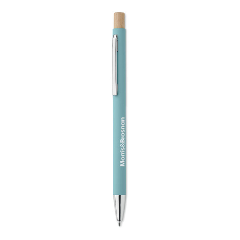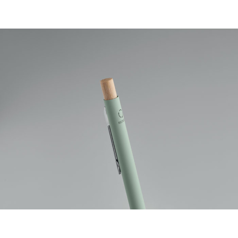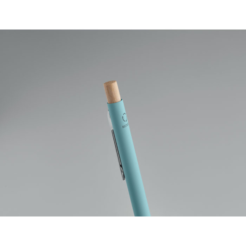 Kuličkové pero z recyklovaného hliníku s bambusovým tlačítkem. Stříbrný hrot a klip. Modrý inkoust.