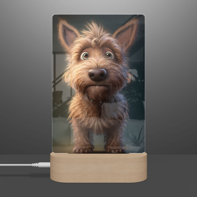 Součástí balení je akrylové sklo dle výběru, dřevěný RGB LED stojánek a napájecí USB kabel.