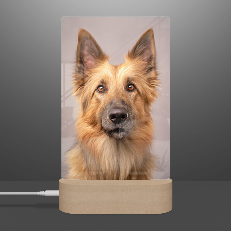 Součástí balení je akrylové sklo dle výběru, dřevěný RGB LED stojánek a napájecí USB kabel.