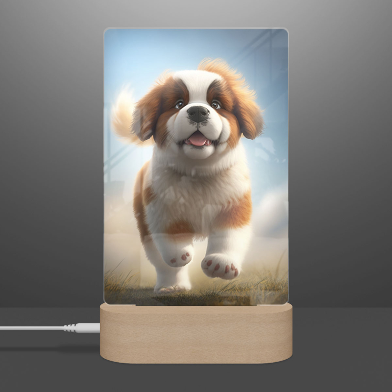 Součástí balení je akrylové sklo dle výběru, dřevěný RGB LED stojánek a napájecí USB kabel.