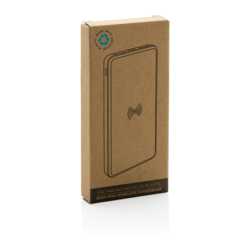 Bezdrátově nabíjecí powerbanka s kapacitou 8 000 mAh vyrobená z RCS recyklovaného ABS plastu se soft touch úpravou a FSC® certifikovaného bambusu. RCS (Recycled Claim Standard) je globální standard, který umožňuje ověřit použití recyklovaného materiálu v produktu napříč celým dodavatelským řetězcem. Podíl použitého recyklovaného materiálu vzhledem k celkové váze produktu: 20 %. Obsahuje vysoce kvalitní lithium polymerovou baterii řady A s kapacitou 8 000 mAh pro plné nabití telefonu až 4x. Včetně indikátorů stavu nabití. Bezdrátové nabíjení je kompatibilní se všemi telefony podporujícími QI, jako jsou nejnovější generace Android, iPhone 8 a výše. Micro USB a USB C vstup: 5V/2A. USB A. Výstup: 5V/2,4A. Bezdrátový výstup: 5V/1A 5W. Včetně nabíjecího kabelu z recyklovaného TPE. Baleno v FSC® krabičce.