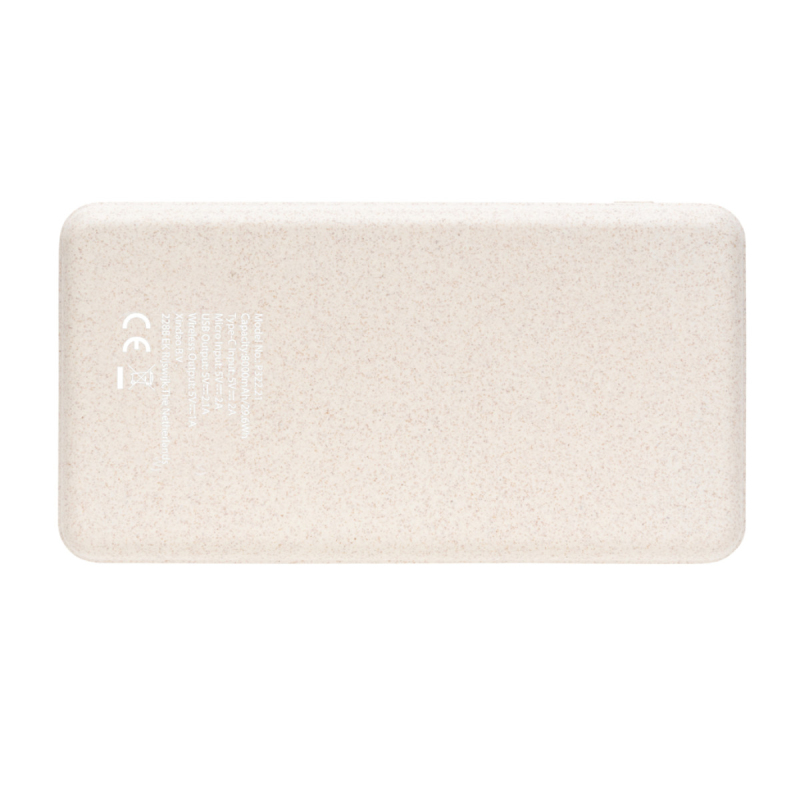 Powerbanka s kapacitou 8 000 mAh a bezdrátovým nabíjením 5W. Vrchní část vyrobená z přírodního korku, zbylé části z kombinace pšeničné slámy (35 %) a ABS. Nabíjení powerbanky je možné skrze micro USB nebo rychlejší USB C. Obsahuje vysoce kvalitní lithium polymerovou baterii řady A o kapacitě 8 000 mAh, čímž tak poskytuje dostatek energie pro plné nabití vašeho telefonu až 4x. Včetně indikátorů stavu nabití. Bezdrátové nabíjení je kompatibilní se všemi telefony podporujícími QI, jako jsou nejnovější generace Android, iPhone 8 a výše. Micro USB vstup: 5V/2A, USB C vstup: 5V/2A. USB výstup: 5V/2.4A; bezdrátový výstup: 5V/1A 5W. Produkt a kabel jsou vyrobeny 100 % bez použití PVC.