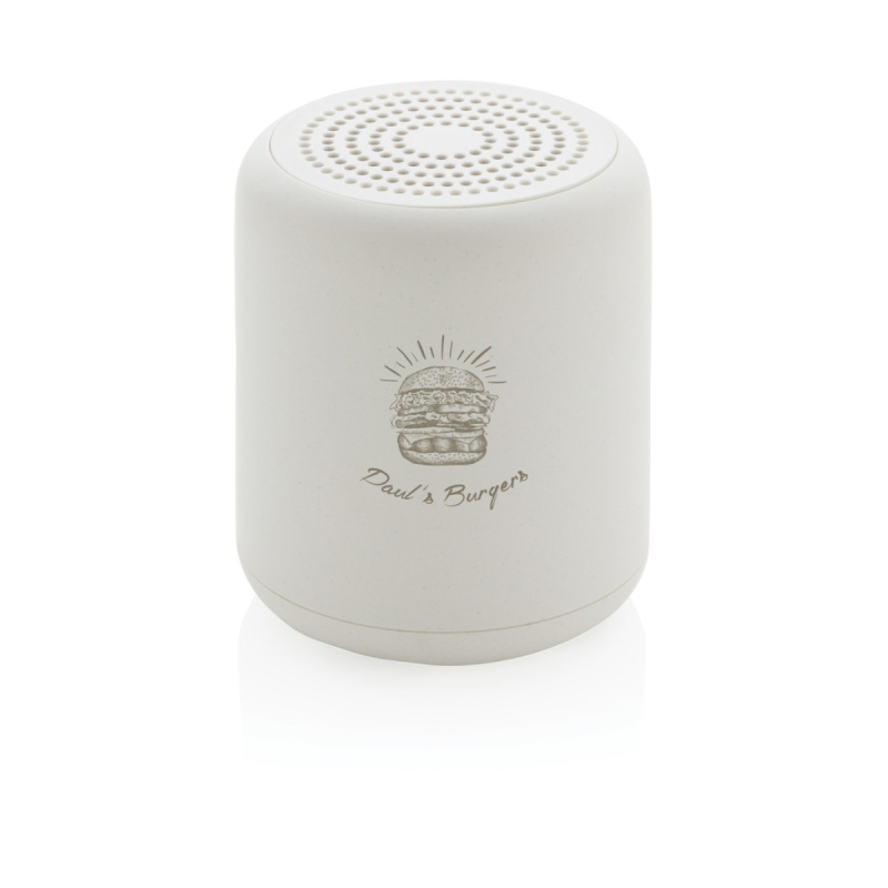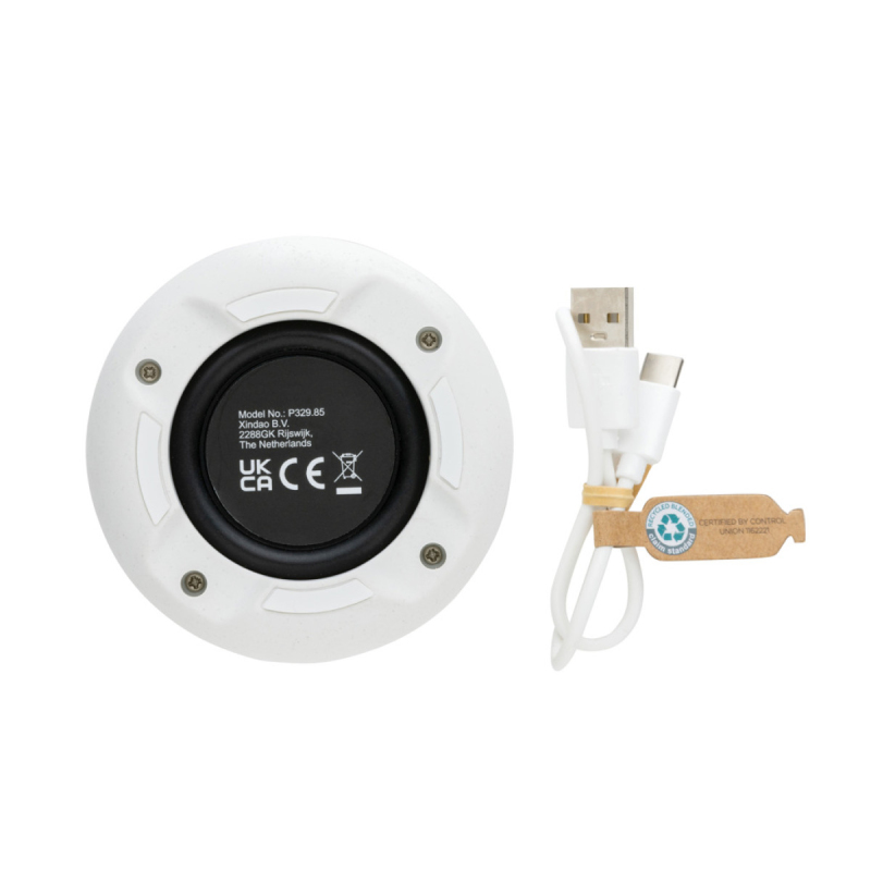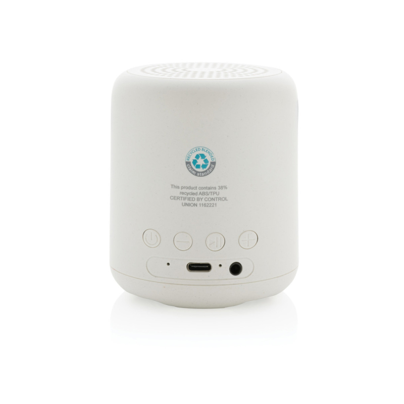 Bezdrátový reproduktor s výkonem 5 W vyrobený z RCS recyklovaného ABS a TPE. RCS (Recycled Claim Standard) je globální standard, který umožňuje ověřit použití recyklovaného materiálu v produktu napříč celým dodavatelským řetězcem. Celkový podíl recyklátu dle váhy produktu: 38 %. 300 mAh baterie umožňuje poslech po dobu až 5 hodin. BT 5.0 pro čisté bezdrátové připojení na vzdálenost až 10m. Mikrofon pro možnost telefonování. Integrované světlo na spodní části. Včetně nabíjecího kabelu z RCS recyklovaného TPE. Baleno v FSC® dárkové krabičce. Produkt i příslušenství kompletně bez PVC.