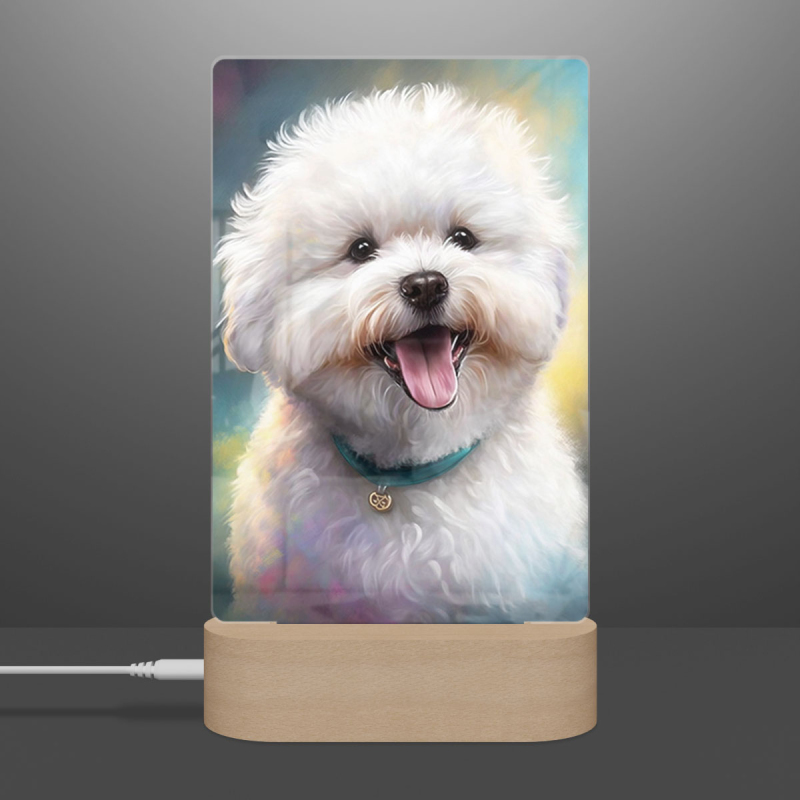 Součástí balení je akrylové sklo dle výběru, dřevěný RGB LED stojánek a napájecí USB kabel.