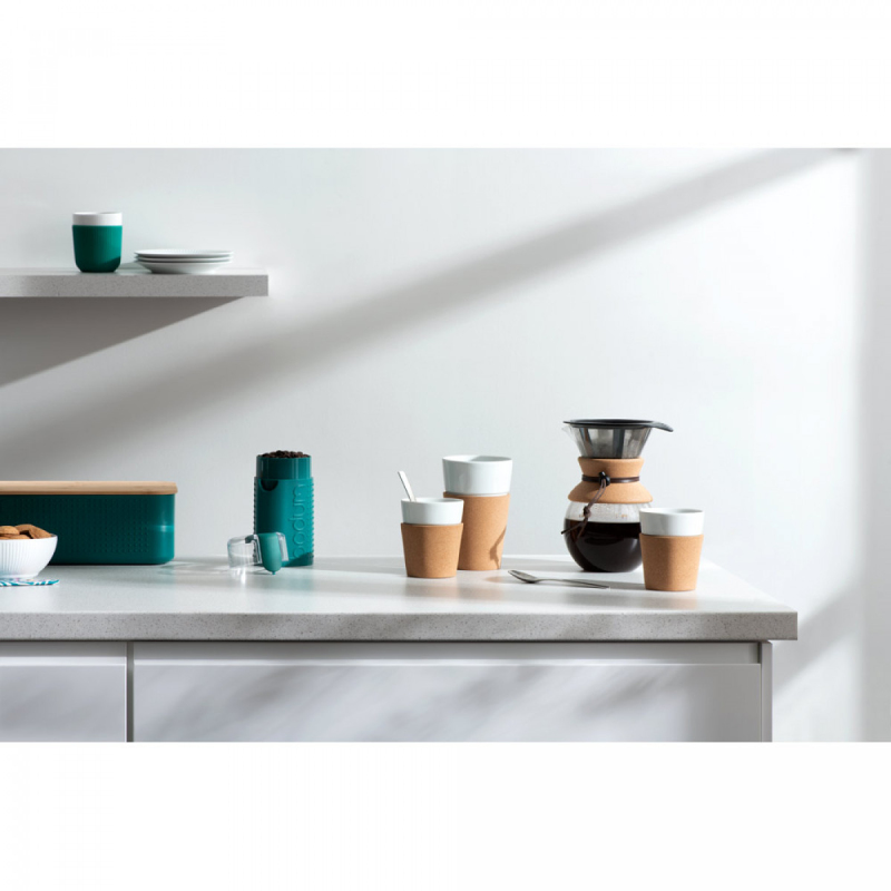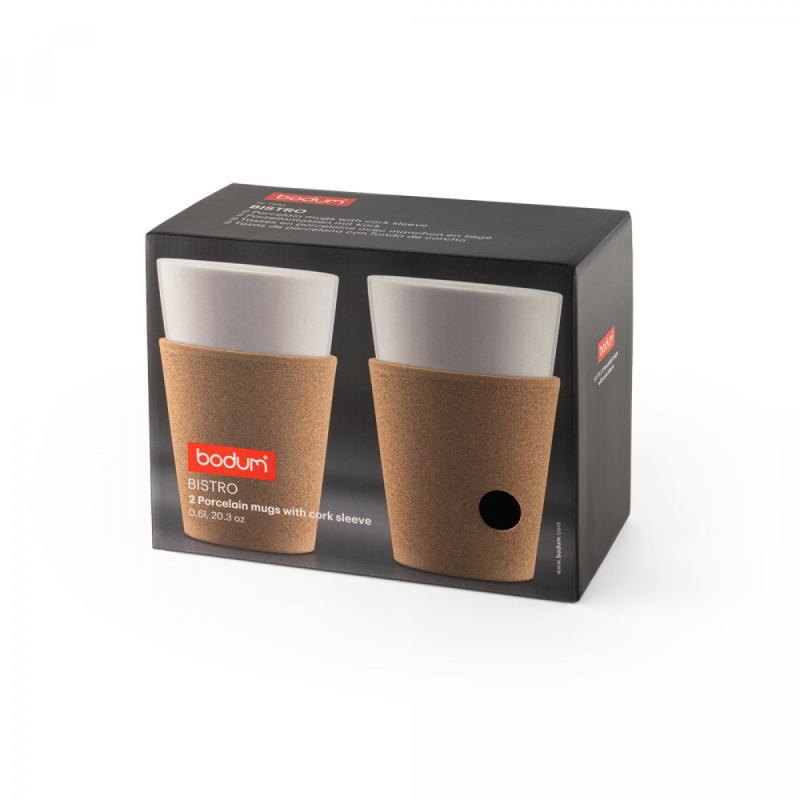 Sada 2 hrnků z kvalitního porcelánu. Hrnky Bistro mají korkovou objímku pro lepší kontrolu a bezpečnost při manipulaci s horkými tekutinami. Jsou vhodné do mrazničky, mikrovlnné trouby a myčky nádobí s výjimkou korkového obalu. Mají objem až 600 mL. Dodáváno v dárkové krabičce. 65 x 146 x 99 mm