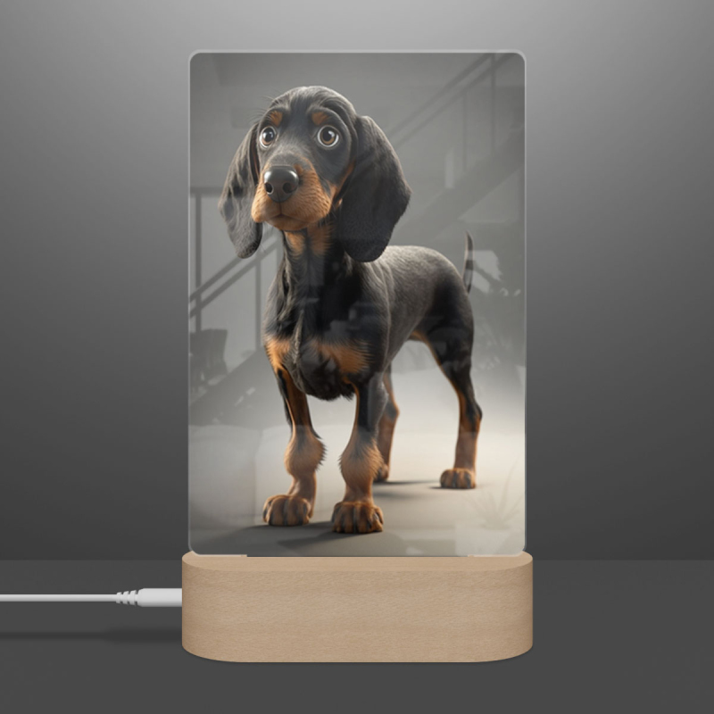 Součástí balení je akrylové sklo dle výběru, dřevěný RGB LED stojánek a napájecí USB kabel.