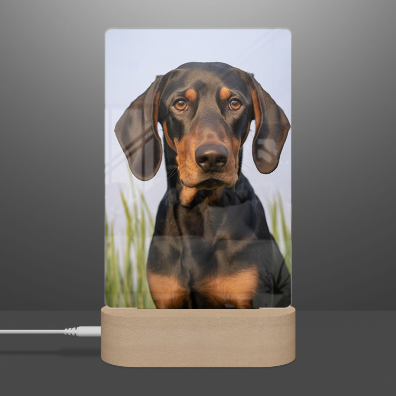 Součástí balení je akrylové sklo dle výběru, dřevěný RGB LED stojánek a napájecí USB kabel.